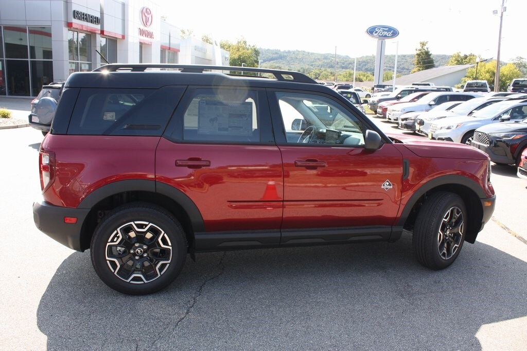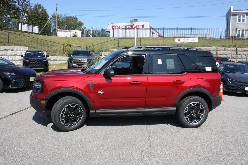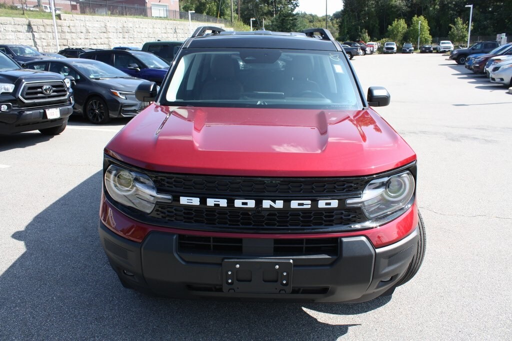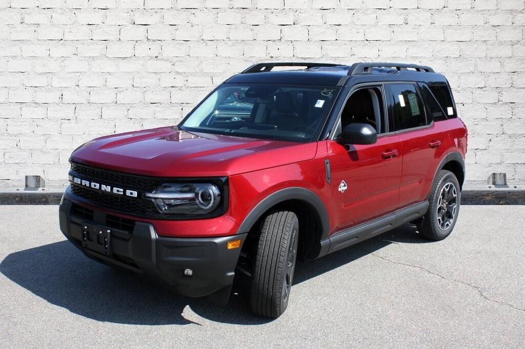 The 2025 Ford Bronco Sport Outer Banks in vibrant Ruby Red Metallic Tinted Clearcoat blends stylish design with advanced technology for a versatile driving experience. Equipped with SiriusXM, SYNC 4 with Enhanced Voice Recognition, and a garage door transmitter, it ensures seamless connectivity and convenience. Enjoy heated front seats, premium trimmed front bucket seats with Ebony/Roast, a heated steering wheel, and an auto-dimming rear-view mirror for premium comfort. Safety is prioritized with remote keyless entry, low tire pressure warning, occupant sensing airbag, rear parking sensors, speed-sensitive and rain sensing wipers, auto high-beam headlights, and heated door mirrors, while front driver/passenger seat back map pockets add practicality, making this Bronco Sport ideal for urban commutes and adventurous getaways.