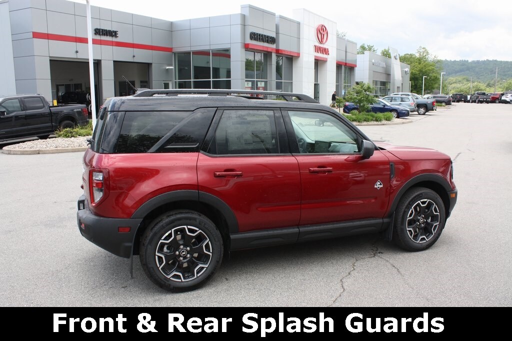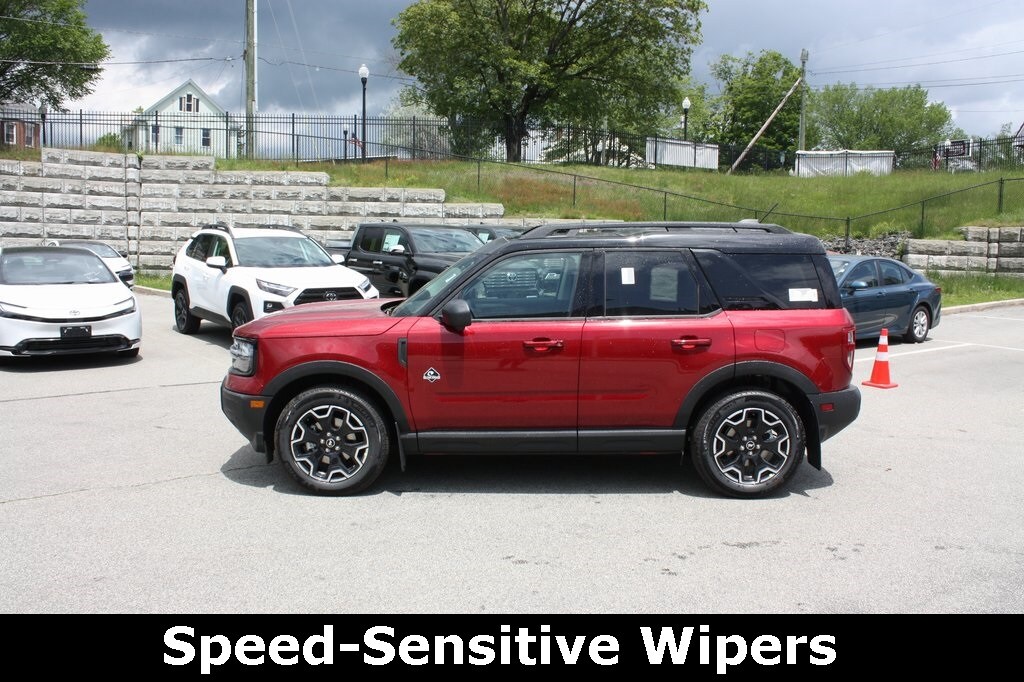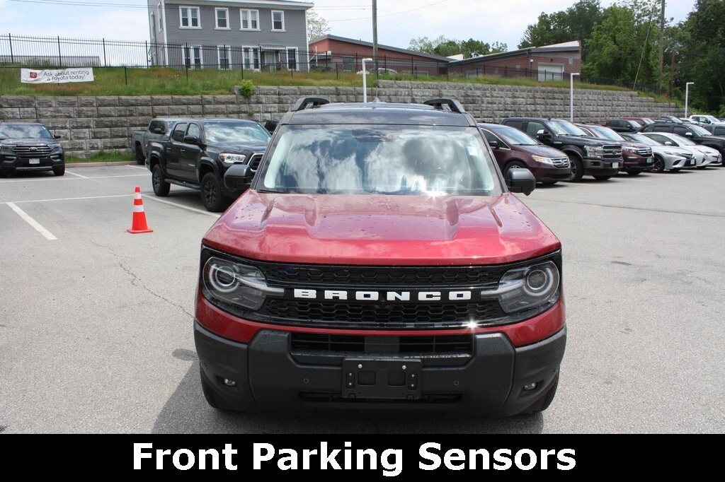 The 2025 Ford Bronco Sport Outer Banks blends bold style and advanced technology in a vibrant Ruby Red Metallic Tinted Clearcoat exterior, enhanced by Front & Rear Splash Guards for a rugged, polished look. Stay connected with SiriusXM, a B&O Sound System by Bang & Olufsen, SYNC 4 with Enhanced Voice Recognition, and Connected Navigation, while Heated Front Seats, a Heated Steering Wheel, and a Power Moonroof create a comfortable cabin. Safety is prioritized with Low Tire Pressure Warning, Front and Rear Parking Sensors, a 360-Degree Camera with Trail & Split View, Reverse Brake Assist, Speed-Sensitive Wipers, Rain Sensing Wipers, Auto High-beam Headlights, and an Auto-dimming Rear-View Mirror, making this Bronco Sport Outer Banks a versatile and tech-savvy compact SUV for urban adventures or off-road escapes.