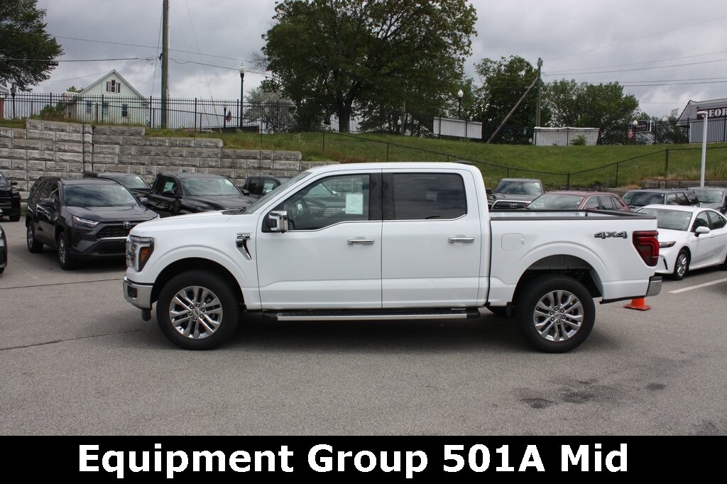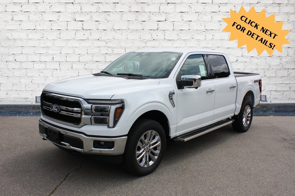 The 2025 Ford F-150 Lariat in crisp Oxford White blends luxurious comfort with cutting-edge technology for an exceptional driving experience. Equipped with Connected Navigation, B&O Sound System by Bang & Olufsen, SiriusXM with 360L, and SYNC 4 with Enhanced Voice Recognition, it ensures premium entertainment and seamless connectivity. Enjoy heated and ventilated ActiveX trimmed bucket seats, a heated steering wheel, and a power-sliding rear window for ultimate comfort, while BlueCruise with a 1-year plan and rain sensing wipers enhance driving ease. A garage door transmitter, turn signal indicator mirrors, and 6" angular bright anodized step bars add convenience and style, making this F-150 Lariat ideal for both rugged tasks and refined adventures.