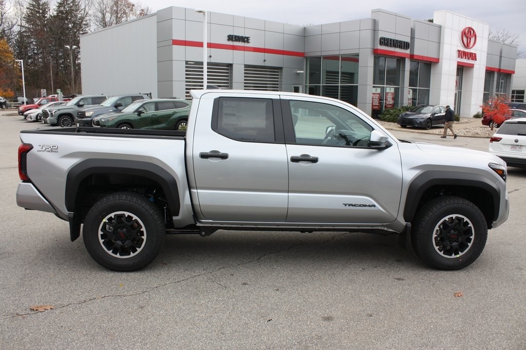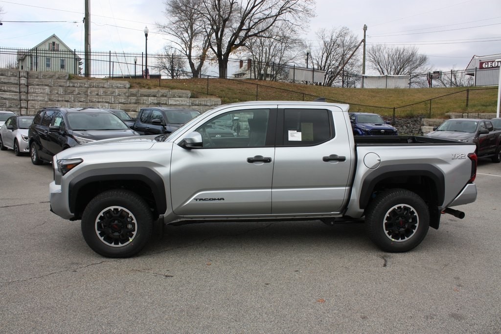 The 2025 Toyota Tacoma TRD Off-Road in sleek Celestial Silver Metallic blends rugged capability with modern technology for an adventurous driving experience. Equipped with SiriusXM and Apple CarPlay/Android Auto, it ensures seamless connectivity and entertainment. Enjoy an auto-dimming rear-view mirror for enhanced visibility, while all-weather floor liners, mudguards, and door edge guards add durability and style. Safety is prioritized with remote keyless entry, anti-whiplash front head restraints, low tire pressure warning, occupant sensing airbag, exterior parking camera, variably intermittent wipers, and turn signal indicator mirrors, making this Tacoma TRD Off-Road ideal for off-road exploration and daily commutes.
