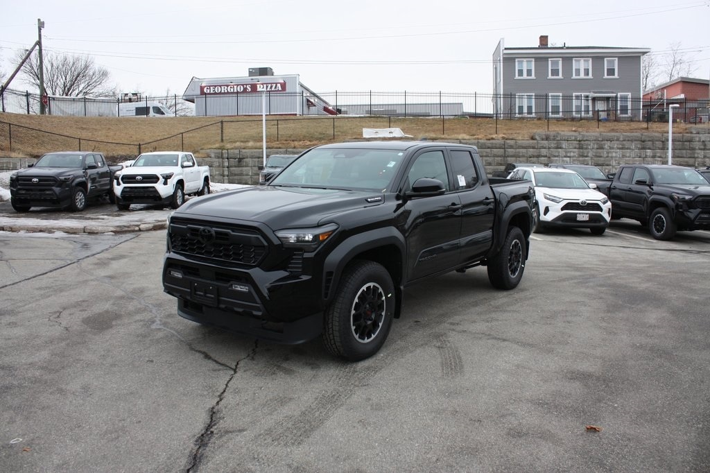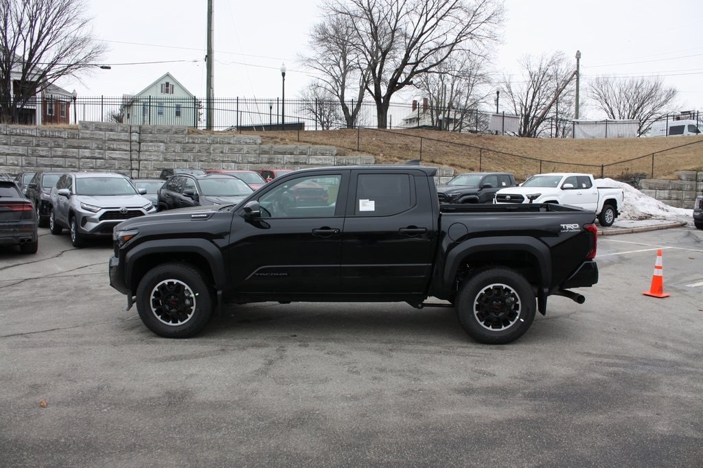 The 2026 Toyota Tacoma TRD Off-Road in sleek Black delivers commanding trail capability with premium comfort and advanced safety for every adventure. It features a moonroof, heated power-adjustable front seats, a leather-trimmed heated steering wheel, and Qi-compatible wireless charging for refined everyday luxury. Confidence comes standard with Toyota Safety Sense 3.0 including Pre-Collision System, Blind Spot Monitor with Rear Cross-Traffic Alert, and a convenient tow hitch receiver. Stylish machined alloy wheels pair with practical mudguards and door edge guards for lasting protection and bold style in this rugged and sophisticated midsize truck.