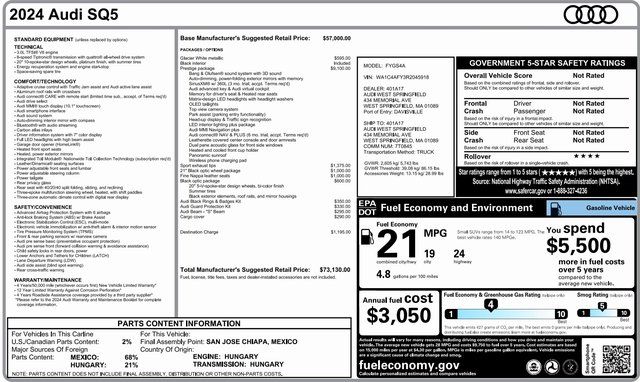 Carfax One Owner, Complete Service Records, Sold New Here, Still Under Factory Warranty, Local Client Trade in on New Audi, Excellent Condition Both Inside and Out, Passed our Comprehensive Quality Inspection and Recently Serviced with Oil Change.**Price excludes, tax, title, and registration fees. Includes, $799 Dealer Documentation fee. CARFAX One-Owner. Clean CARFAX. Glacier White 2024 Audi SQ5 Prestige quattro quattro 8-Speed Automatic with Tiptronic 3.0L TFSI **Price excludes, tax, title, and registration fees. Includes, $799 Dealer Documentation fee..