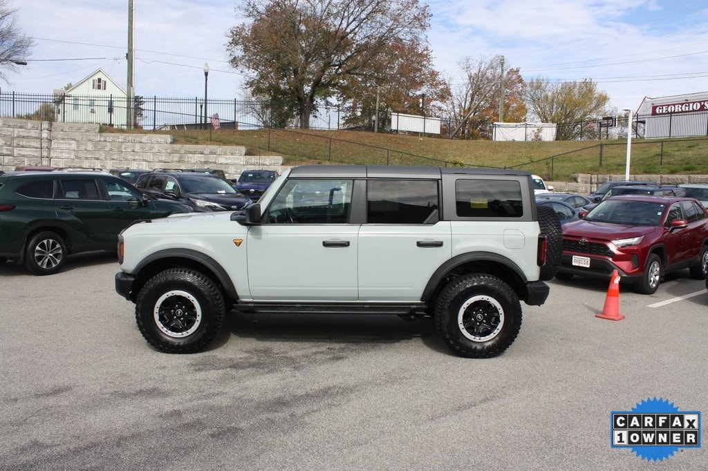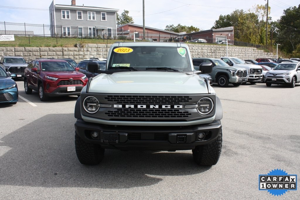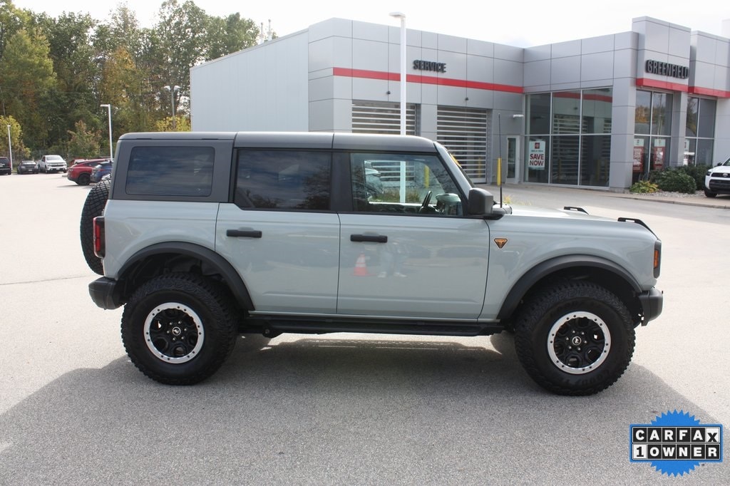 The 2023 Ford Bronco Badlands in striking Cactus Gray blends rugged capability with advanced technology for an exhilarating off-road experience. Equipped with SiriusXM with 360L, SYNC 4 with Enhanced Voice Recognition, and Connected Navigation, it ensures seamless connectivity and effortless navigation. Safety is prioritized with BLIS Blind Spot Information System, Pre-Collision Assist with Automatic Emergency Braking, Lane-Keeping System, 2-Door Intelligent Access with lock/unlock, rear parking sensors, exterior parking camera, rear-view camera, and base LED headlamps for confident handling. Features like position-sensitive Bilstein shock absorbers, integrated roll-over protection, hard top sound deadening headliner, rear-window defroster and washer, heated door mirrors, and remote keyless entry enhance durability and comfort, making this Bronco Badlands ideal for adventurous trails and urban commutes.