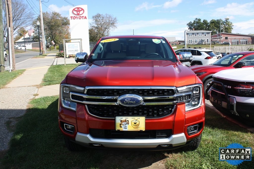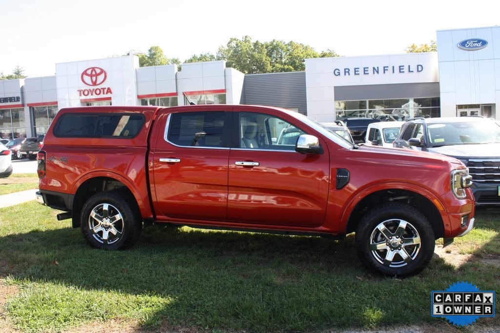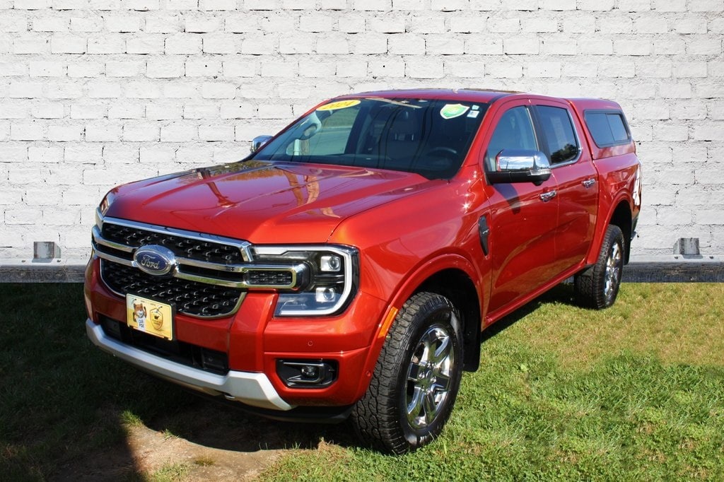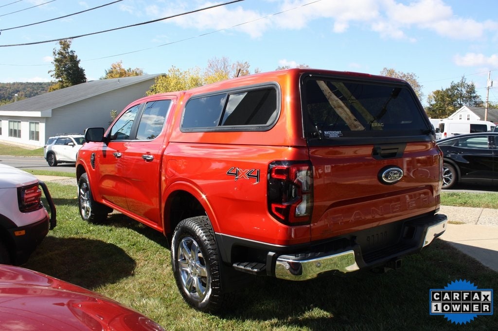The 2024 Ford Ranger Lariat in vibrant Hot Pepper Red Metallic Tinted Clearcoat blends bold style with advanced technology for a premium driving experience. Equipped with SYNC 4A with Connected Built-In Navigation, SiriusXM Satellite Radio, and a B&O Sound System by Bang & Olufsen, it ensures seamless connectivity and immersive audio. Enjoy leather-trimmed front heated bucket seats and a heated steering wheel for comfort, while a tough bed spray-in bedliner, integrated box side step, chrome tow hooks, and front and rear splash guards enhance durability and utility. Safety and towing are prioritized with an exterior parking camera, rain sensing wipers, reverse park aid with trailer guidance, trailer brake controller, Pro Trailer Backup Assist, Class IV trailer hitch receiver, and turn signal indicator mirrors, making this Ranger Lariat ideal for work and adventurous journeys.