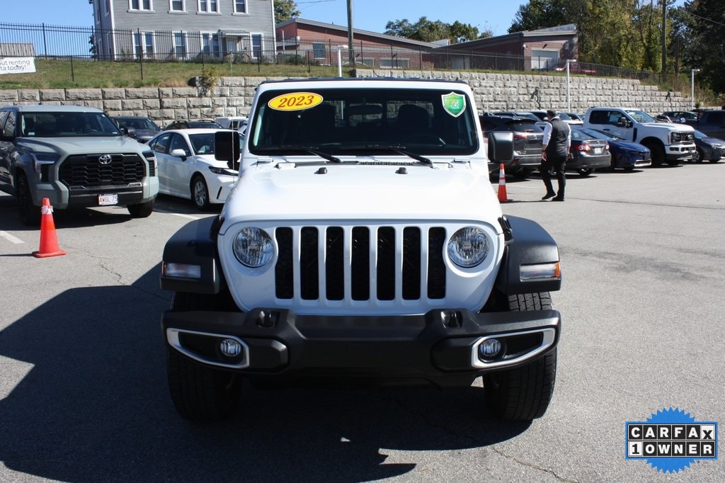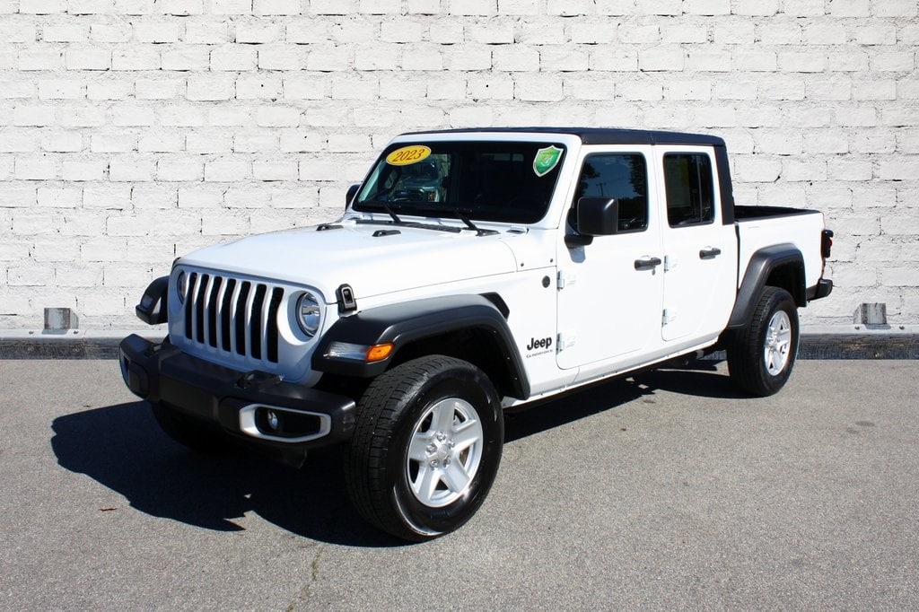 The 2023 Jeep Gladiator Sport in vibrant Bright White Clearcoat blends rugged capability with modern technology for an adventurous driving experience. Equipped with GPS Antenna Input, Integrated Voice Command with Bluetooth, Apple CarPlay/Android Auto, and 4G LTE Wi-Fi Hot Spot, it ensures seamless connectivity and entertainment. Enjoy a premium wrapped steering wheel, front 1-touch down power windows, speed sensitive power locks, and sun visors with illuminated vanity mirrors for comfort and convenience, while a rear window defroster, deep tint sunscreen windows, and freedom panel storage bag add practicality. Safety is prioritized with integrated roll-over protection, ParkView Rear Back-Up Camera, remote keyless entry, and a compass, making this Gladiator Sport ideal for off-road thrills and daily commutes.