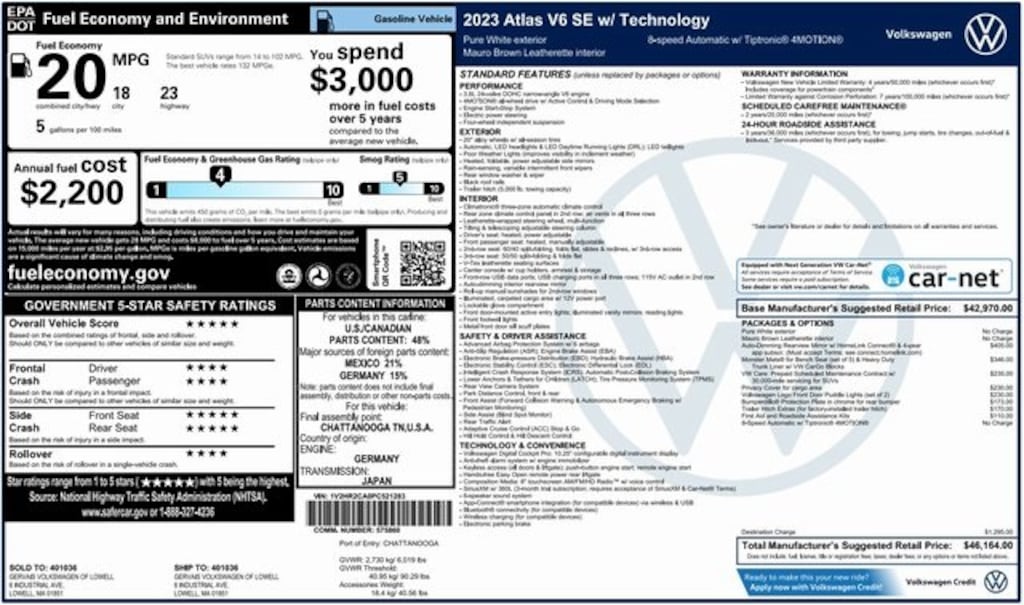 Trailer Hitch Extras, 17" Alloy wheels, 3.60 Axle Ratio, 3rd row seats: split-bench, 4-Wheel Disc Brakes, 6 Speakers, ABS brakes, Air Conditioning, AM/FM radio: SiriusXM with 360L, Auto-Dimming Rear-View Mirror, Auto-dimming Rear-View mirror, Automatic temperature control, Brake assist, Bumperdillo Protection Plate for Rear Bumper, Bumpers: body-color, Compass, Delay-off headlights, Driver door bin, Driver vanity mirror, Dual front impact airbags, Dual front side impact airbags, Electronic Stability Control, Emergency communication system: VW Car-Net Safe & Secure 5-year, Exterior Parking Camera Rear, First Aid Kit, Four wheel independent suspension, Front anti-roll bar, Front Bucket Seats, Front Center Armrest, Front dual zone A/C, Front fog lights, Front reading lights, Fully automatic headlights, Heated Comfort Front Bucket Seats, Heated door mirrors, Heated front seats, Heavy Duty Trunk Liner w/VW CarGo Blocks, Illuminated entry, Leather Shift Knob, Low tire pressure warning, Occupant sensing airbag, Outside temperature display, Overhead airbag, Overhead console, Panic alarm, Passenger door bin, Passenger vanity mirror, Perforated V-Tex Leatherette Seating Surfaces, Power door mirrors, Power driver seat, Power Liftgate, Power steering, Power windows, Privacy Cover, Radio data system, Radio: MIB3 Composition Media w/8" Touchscreen, Rain sensing wipers, Rear air conditioning, Rear anti-roll bar, Rear reading lights, Rear seat center armrest, Rear window defroster, Rear window wiper, Remote keyless entry, Roadside Assistance Kit, Rubber Mats Kit - Bench Seats, Security system, Speed control, Speed-sensing steering, Split folding rear seat, Spoiler, Standard Suspension, Steering wheel mounted audio controls, Tachometer, Telescoping steering wheel, Tilt steering wheel, Traction control, Trip computer, Turn signal indicator mirrors, Variably intermittent wipers, Volkswagen Logo Puddle Lights, VW Care, and Wheels: 20" x 8J 5-Spoke Silver Painted Alloy.