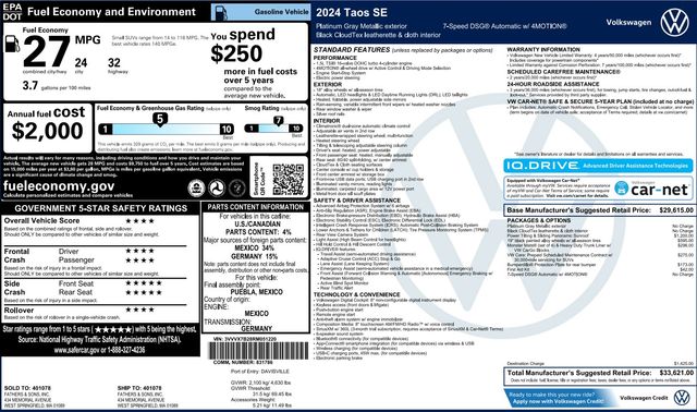 LOCATED AT XXX MEMORIAL AVE!! Carfax One Owner, Complete Service Records, Sold New Here, Still Under Factory Warranty, Local Client Trade in on New VW, Excellent Condition Both Inside and Out, Passed our Comprehensive Quality Inspection and Recently Serviced with Oil Change.**Price excludes, tax, title, and registration fees. Includes, $799 Dealer Documentation fee. CARFAX One-Owner. Clean CARFAX. Platinum Gray Metallic 2024 Volkswagen Taos 1.5T SE AWD 7-Speed DSG Automatic with Tiptronic 1.5L I4 Turbocharged DOHC 16V LEV3-SULEV30 158hp **Price excludes, tax, title, and registration fees. Includes, $799 Dealer Documentation fee..